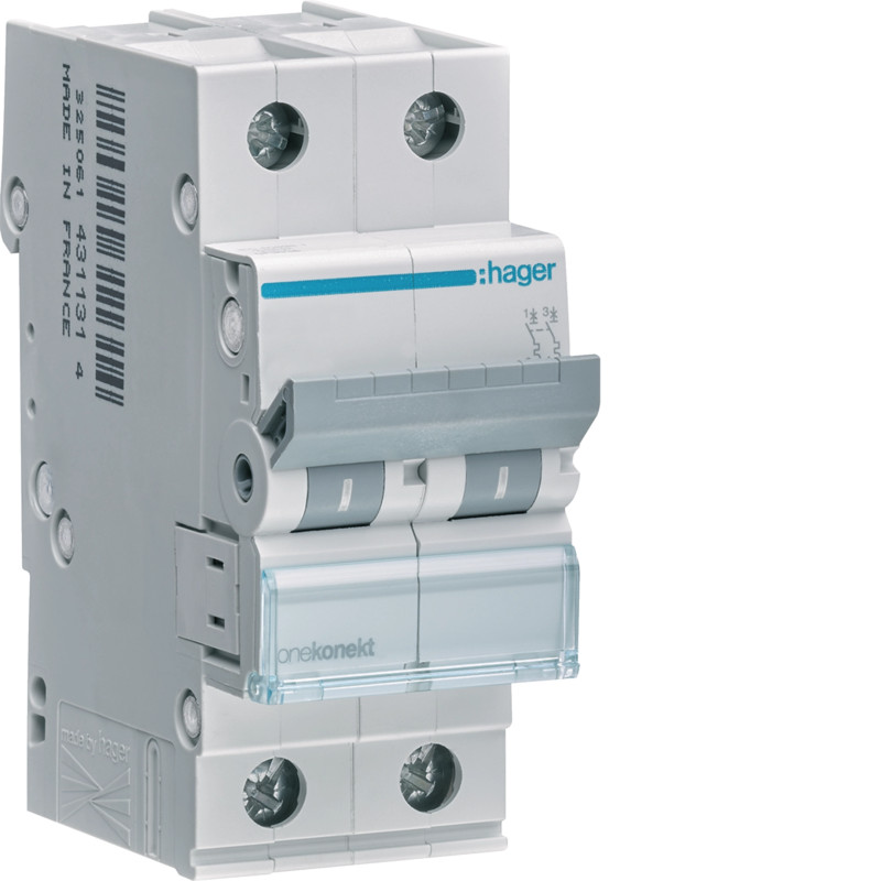 MCN225 - Disjoncteur Hager bipolaire 25A - 2P - 6/10kA - courbe C - Bornes à vis alignées - 2 modules