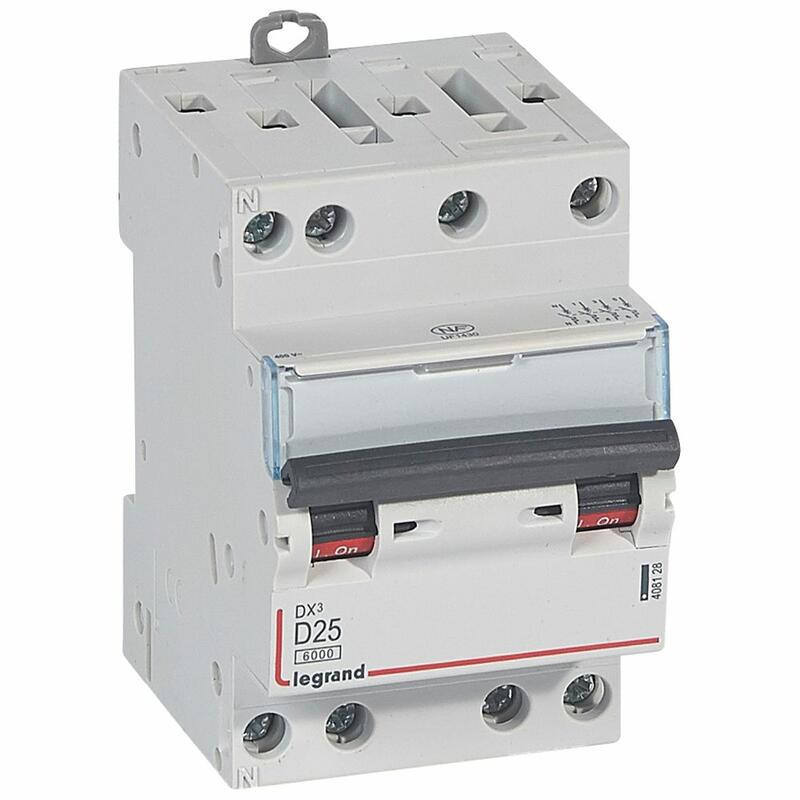 408128 Legrand DX3 - Disjoncteur tétrapolaire 25A 4P D25 - 6/10kA - 400V - Courbe D - Vis/vis - 3 modules - Peigne HX3